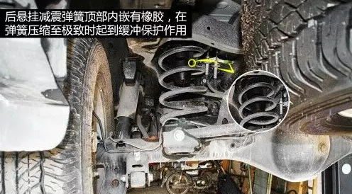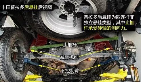 普拉多后四連桿結(jié)構(gòu)帶止推桿,止推桿一頭連接在車身上,一頭連接到硬軸上,承受硬軸的側(cè)向力作用,上下控制臂則承受車輪的上下跳動力。后懸掛減震彈簧頂部內(nèi)嵌有橡膠,在彈簧壓縮至極致時起到緩沖保護作用。